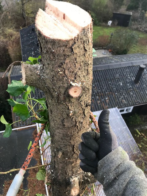 Vi fælder træerne fra jorden såfremt der er plads til dette. Ellers tager vi dem ned fra toppen i mindre sektioner.