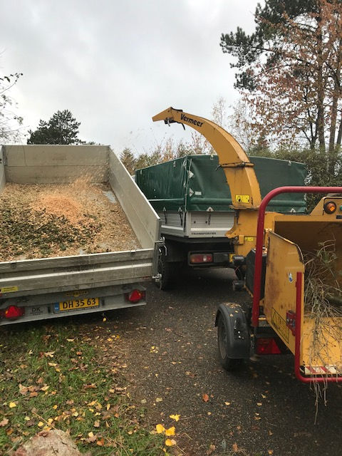 Du kan bruge grenaffaldet som flis til bede, hvis det ønskes. Så medbringer vi vores flishugger. Når store grene og stammen er fri, så smider vi det i flishuggeren, som laver træflis ud af det. Det er super godt, hvis du eksempelvis gerne vil give dine bede et pænt udseende. Ligeledes er det også en sjov måde at genanvende det fældne træ på.